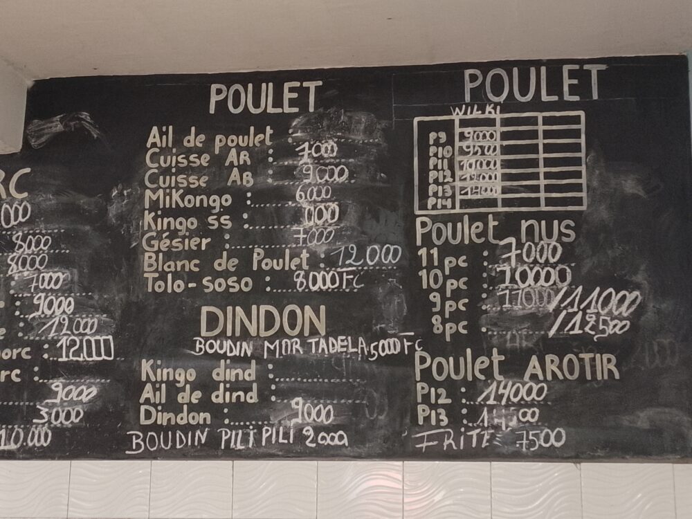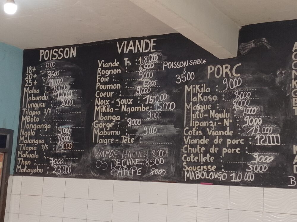 Dans cette chambre froide, certains produits n’ont pas connu de baisse de prix, notamment le poisson Ngolo vendu toujours à 9.000 Fc le Kg ; le Mikongo à 6.000 FC ; le Dindon à 9.000 FC ou encore la queue de bœuf à 15.000 Fc le Kg.