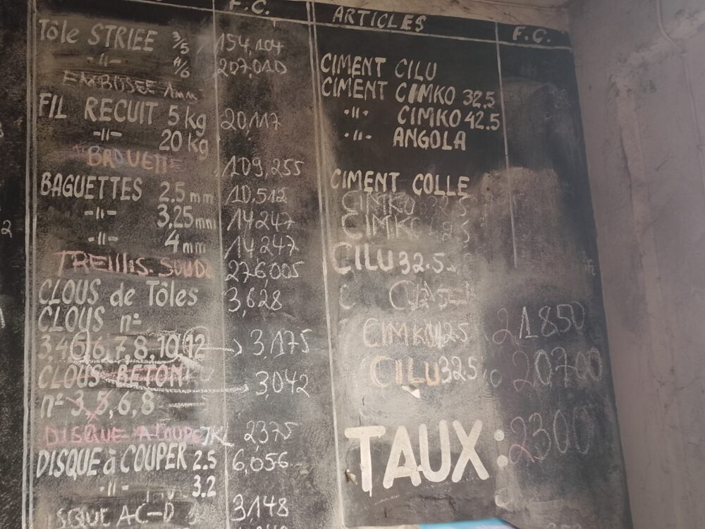 Dans la plus grande quincaillerie de Pompage, dès l’entrée, on voit afficher sur le tableau des tarifs, le taux de change fixé à 2.300 FC. A la question de savoir si les prix ont baissé dans cette quincaillerie, le gérant répond spontanément « Tout a baissé en fonction du taux de change ». Il nous dit que la barre de fer de 12mm est vendue actuellement à 31.400 FC venant de plus de 39.000 FC. Quant au ciment, il est passé aussi ici de 28.000 Fc à 21.850 FC (CIMKO) et 20.700 FC (CILU).