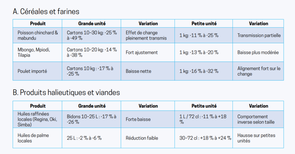 En somme, conclut la vice-primature en charge de l’Economie, l’effet de l’appréciation du CDF s’est manifesté principalement sur les grands conditionnements vendus en gros, où la formation du prix suit directement les cotations à l’import. Les petites unités, plus proches du consommateur final, montrent une inertie structurelle : leur ajustement reste faible, confirmant que les gains de change sont absorbés en amont de la chaîne de distribution. Les baisses significatives se concentrent sur les formats de gros, bénéficiant directement de la réévaluation du CDF. Les petites unités, distribuées au détail, conservent une rigidité des prix.