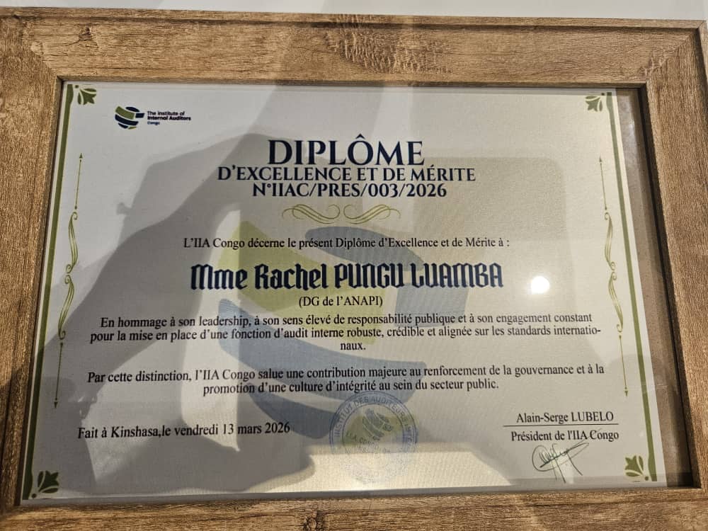 Parmi les personnalités présentes figurait Madame Rachel PUNGU LUAMBA, Directrice Générale de l’Agence Nationale pour la Promotion des Investissements (ANAPI). A cette occasion, elle a été distinguée par un diplôme d’excellence et de mérite en reconnaissance de son engagement en faveur de la bonne gouvernance et du renforcement des mécanismes de contrôle interne au sein de son institution.
