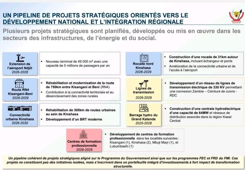 Autant dire que certains projets cités par le ministre des Finances nécessiteront des financements supplémentaires à identifier. C’est le cas de la construction d’un nouveau terminal à l’aéroport de N’djili de Kinshasa dont le coût est estimé à environ 570 millions de dollars USD. Il est mené par la firme INFRAROSE, ce chantier vise la réalisation d’une nouvelle aérogare de 49.000 m² capable d’accueillir 5 millions de passagers par an. Le démarrage des travaux était prévu pour octobre 2025 et une livraison attendue en 2028.