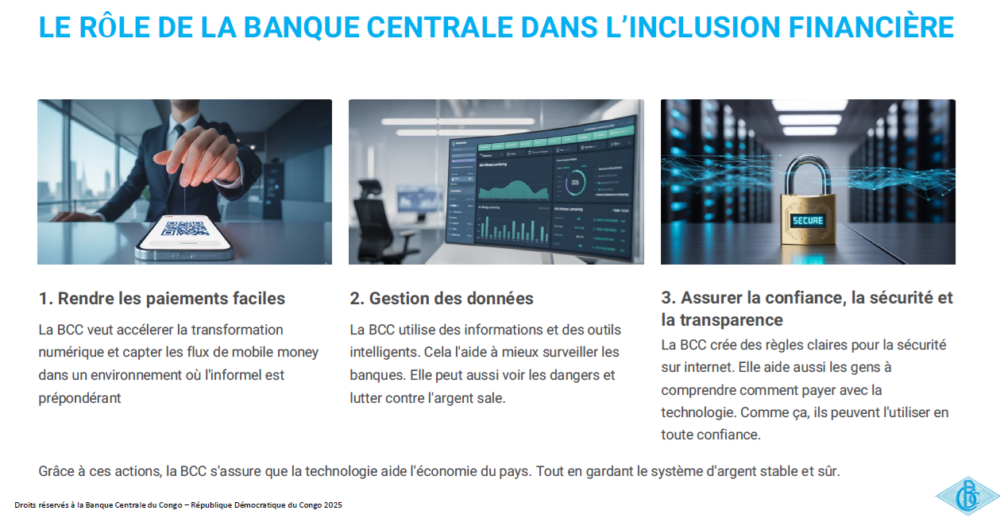 Au cœur de cette transformation, la stratégie numérique. En 2021, la RDC s’est dotée d’un Code numérique intégrant la protection des données, l’inclusion financière digitale, le renforcement de la cyber sécurité et la réglementation des transactions électroniques. La BCC entend jouer un rôle central en accélérant la transformation numérique, la circulation monétaire et en facilitant les paiements digitaux jusque dans les coins les plus reculés. Grâce à l’utilisation du Smartphone, de l’IA et à la collecte de données, dans 5 à 10 ans, il sera désormais possible pour les banques d’évaluer la solvabilité d’un petit commerçant et de lui accorder un crédit quasi instantanément.