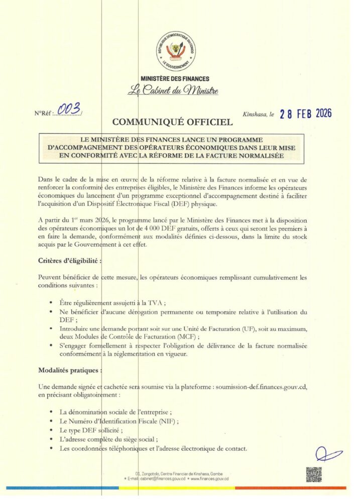 Le Ministère des Finances informe les opérateurs économiques régulièrement assujettis à la TVA que, depuis le 1er mars 2026, un programme exceptionnel d’accompagnement est en cours dans le cadre de la mise en œuvre de la réforme de la facture normalisée.