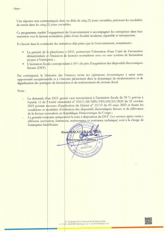 À ce titre, 4 000 Dispositifs Électroniques Fiscaux (DEF) physiques sont mis gratuitement à la disposition des entreprises éligibles, dans la limite du stock disponible, pour faciliter leur mise en conformité.