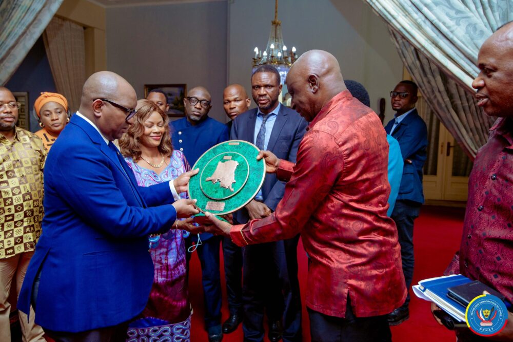 Les représentants de la délégation de l’Union Sacré de la Nation ont saisi cette opportunité pour offrir un présent en malachite, une œuvre d’art représentant la carte de la RDC, au président du Sénat, haut cadre de leur plate-forme politique.