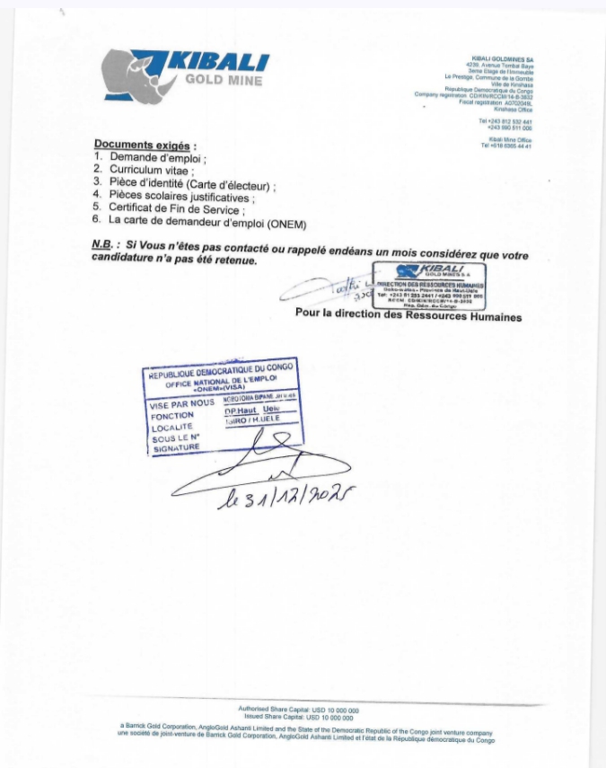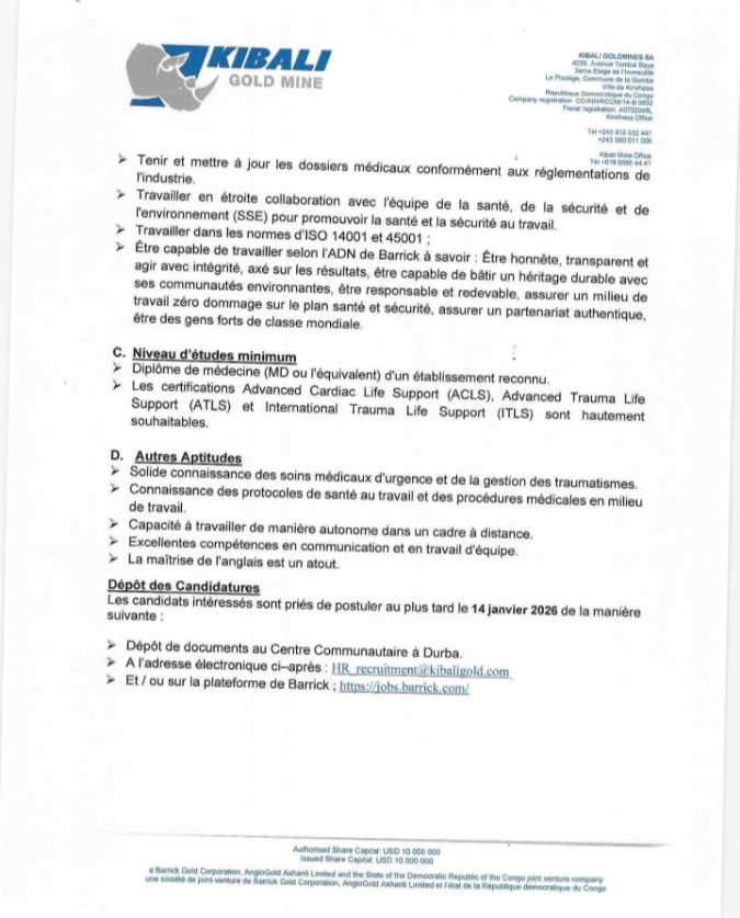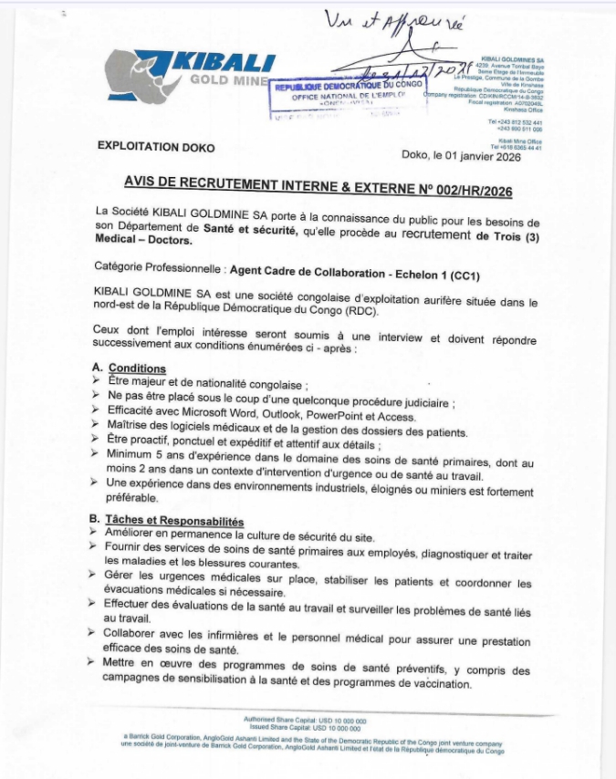 La société minière Kibali Gold Mine SA, spécialisée dans l’exploitation aurifère au nord-est de la République démocratique du Congo, lance un recrutement interne et externe pour le compte de son Département Santé et Sécurité. Trois (3) postes de Medical Doctors, de catégorie Agent Cadre de Collaboration – Échelon 1 (CC1), sont à pourvoir afin de renforcer la prise en charge médicale et la sécurité sanitaire sur ses sites opérationnels.