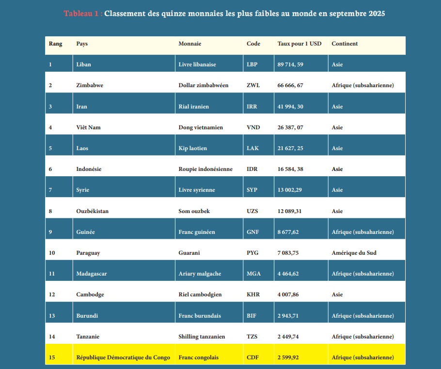 Notre analyse porte sur l’identification de quinze monnaies figurant parmi les devises les plus faibles au monde en septembre 2025. L’objectif est de vérifier si les tendances observées pour ces monnaies faibles suivent le même schéma que celles constatées pour les monnaies fortes.