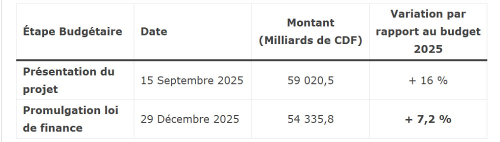 En tenant compte du taux de change artificiel, le Parlement a dû revoir ses ambitions à la baisse. Le budget a perdu 5 000 milliards de FC (soit plus de 2 milliards USD) en trois mois. Cette contraction limite drastiquement la capacité du gouvernement à financer les infrastructures et à payer les arriérés de salaires des fonctionnaires.