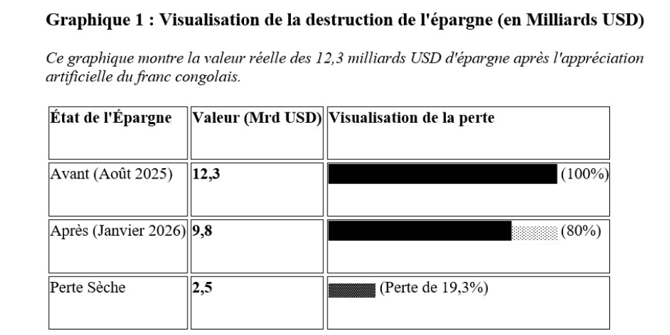Au premier semestre 2025, les dépôts bancaires s’élevaient à 13,7 milliards USD, dont 90 % (soit 12,3 milliards) sont libellés en dollars américains. En imposant une appréciation brutale de près de 20 %, la BCC a mécaniquement réduit la valeur réelle de ces avoirs une fois convertis. On a ainsi une perte sèche : les 12,3 milliards USD d’épargne ne représentent plus en réalité que 9,8 milliards par rapport à leur valeur initiale. Conséquence : Une ponction invisible de 2,5 milliards USD sur les ressources des ménages et des entreprises.