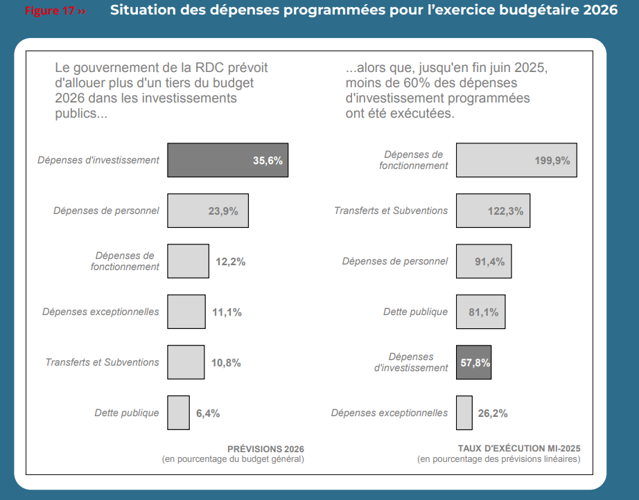 Le gouvernement affiche une ambition forte pour l’investissement public, avec plus d’un tiers du budget général qui lui est consacré. Les dépenses d’investissement atteignent USD 6,59 milliards (35,6% du budget), marquant une priorité affichée pour les infrastructures et les projets structurants. À ce titre, il y a lieu de mentionner (i) le programme de renforcement de l’offre et de développement de l’accès aux soins de santé, (ii) le projet d’aménagement de la route nationale N°2 Bukavu-Goma, (iii) le projet d’appui à la connectivité et de transport (PACT), (iv) le projet de gouvernance et de réforme de l’accès aux secteurs d’électricité et de l’eau, et (v) le projet d’accès et d’amélioration des services électriques (PAASE). Cette orientation stratégique répond aux impératifs d’accès aux soins de santé, de désenclavement des territoires, et de réhabilitation des infrastructures hydro-électriques.