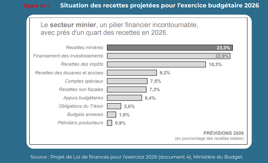 Le secteur minier demeure un pilier financier incontournable en RDC (cf. Figure 1 en annexe). Avec USD 4,75 milliards attendus, les recettes minières devraient représenter près du quart des recettes totales du budget général (23,3%) en 2026. Cette dépendance expose les finances publiques aux fluctuations des cours mondiaux des matières premières, particulièrement pour le cuivre et le cobalt dont les prix sont sujets à volatilité.