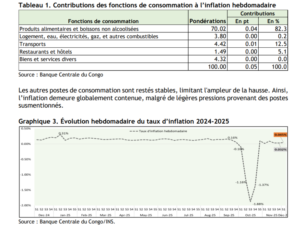 A la première semaine du mois de décembre 2025, le taux d’inflation hebdomadaire s’est établi à 0,05 % contre 0,03 % la semaine précédente. Cette légère accélération s’observe dans un contexte général de stabilité des prix.
