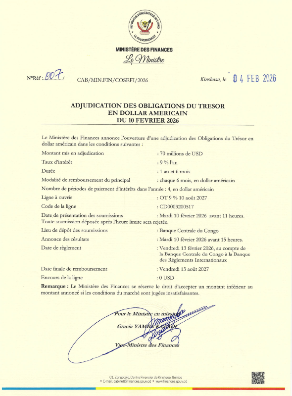 Au cours de ce premier trimestre 2026, le calendrier des émissions des Bons et Obligations du Trésor cible de lever 400 millions USD et 500 milliards de CDF.