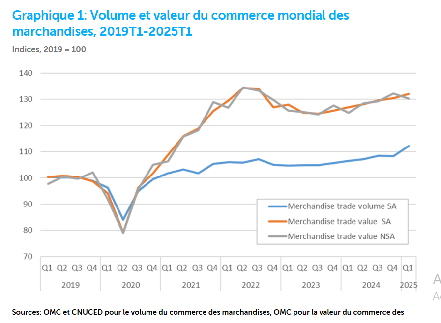 Par ailleurs, la valeur du commerce mondial des marchandises en dollars EU — mesurée par les exportations non corrigées des variations saisonnières — a augmenté de 4% en glissement annuel au premier trimestre de 2025, ce qui reflète une forte croissance en volume et une baisse des prix (graphique 1). Au premier trimestre, la valeur des échanges a diminué par rapport au trimestre précédent en raison des variations saisonnières habituelles, mais les chiffres corrigés des variations saisonnières ont continué d’augmenter.