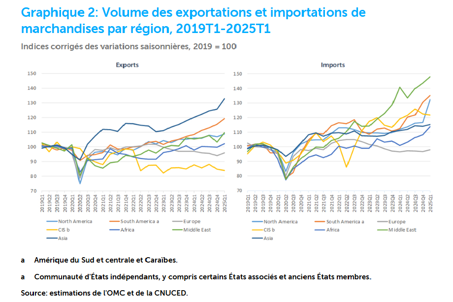Les nouveaux droits de douane annoncés par les États-Unis le 2 avril, au début du deuxième trimestre, ont été largement anticipés, ce qui a permis aux importateurs d’avancer les achats pour éviter de payer des droits plus élevés par la suite. Au premier trimestre, la croissance du volume des échanges a été supérieure aux projections publiées le 16 avril dans le rapport “Perspectives et statistiques du commerce mondial” de l’OMC, à la fois s’agissant de la prévision de base de 2,7% pour 2025 posée par le Secrétariat, laquelle supposait la poursuite des politiques en vigueur en début d’année, et de la prévision ajustée de -0,2% qui s’appuyait sur les politiques en vigueur au 16 avril.