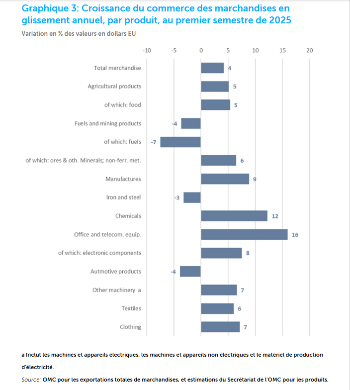 Le graphique 3 montre la croissance en glissement annuel de la valeur en dollars EU du commerce mondial des marchandises, par grande catégorie de produits, au premier trimestre.1 Les meilleurs résultats ont été enregistrés pour le matériel de bureau et de télécommunication (+16% en glissement annuel), devant les produits chimiques (+12%) et les vêtements (+7%). Parmi les catégories de produits considérées, seuls les produits de l’industrie automobile (-4%), les combustibles et produits miniers (-4%, dont -7% pour les combustibles), et le fer et l’acier (-3%) ont diminué en valeur. Si les prix des combustibles ont peu varié par rapport au même trimestre de l’année précédente, ceux des métaux et des minéraux (à l’exclusion de l’or et de l’argent) ont augmenté de 8%.