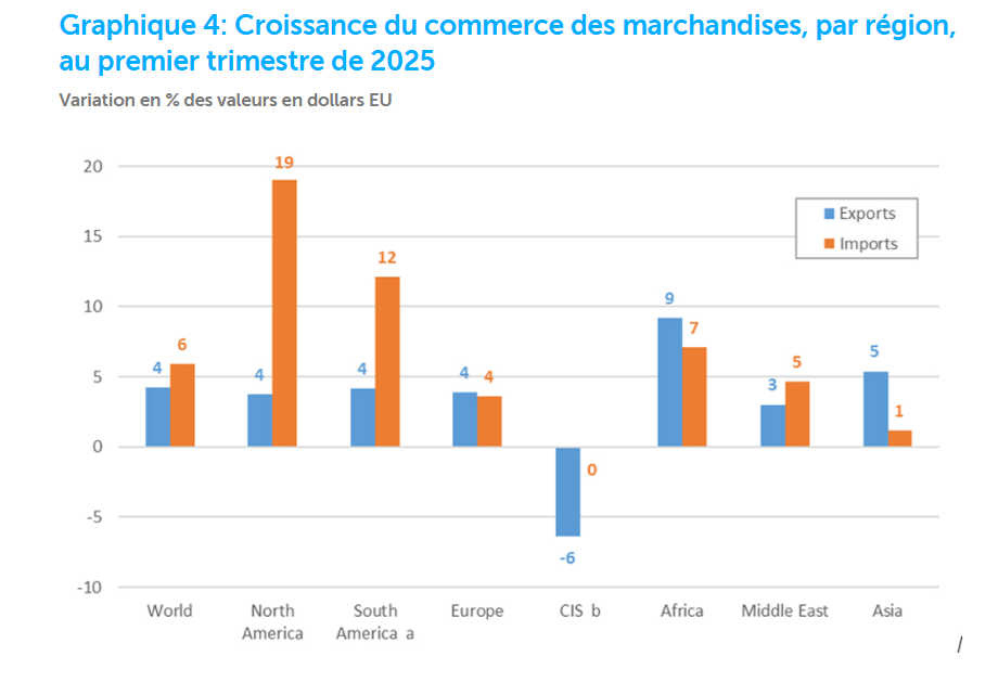 Au premier trimestre, la croissance du volume du commerce des marchandises a été très disparate selon les régions, en particulier pour les importations (graphique 2). L’Amérique du Nord est de loin la région qui a enregistré la plus forte croissance des importations en glissement trimestriel, à 13,4%, devant l’Afrique (5,1%), l’Amérique du Sud et centrale et les Caraïbes (3,6%), le Moyen-Orient (3,0%), l’Europe (1,3%) et l’Asie (1,1%). La Communauté d’États indépendants (CEI), y compris certains États associés et anciens États membres, a été la seule région à enregistrer une baisse au premier trimestre, à -0,5%.  S’agissant des exportations, le Moyen-Orient a enregistré la plus forte croissance en glissement trimestriel, à 6,3%, devant l’Asie (5,6%), l’Amérique du Sud (3,2%), l’Afrique (2,5%), l’Europe (1,9%) et l’Amérique du Nord (1,8%). La région de la CEI a aussi enregistré une baisse des exportations de -1,0% au premier trimestre.