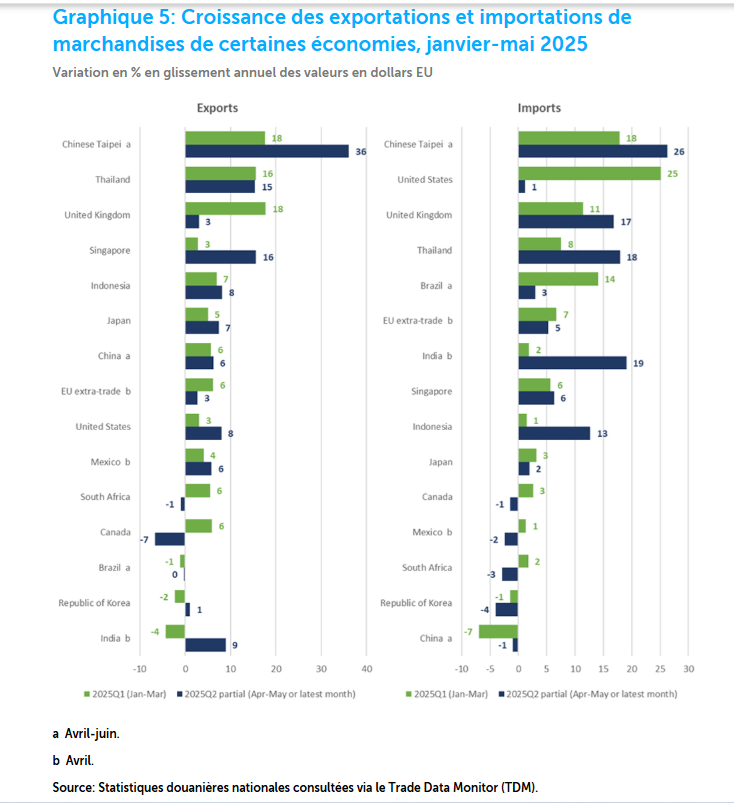 Les statistiques mensuelles du commerce des marchandises en valeur sont disponibles pour de nombreux pays jusqu’au deuxième trimestre de 2025.  Ces données montrent que la demande d’importations a commencé à ralentir après la poussée du premier trimestre. Cela est illustré dans le graphique 5, qui montre la croissance en glissement annuel de la valeur en dollars EU des exportations et importations de marchandises en 2025 pour certaines économies au premier trimestre, ainsi que des données partielles pour le deuxième trimestre (avril-mai ou le dernier mois disponible).