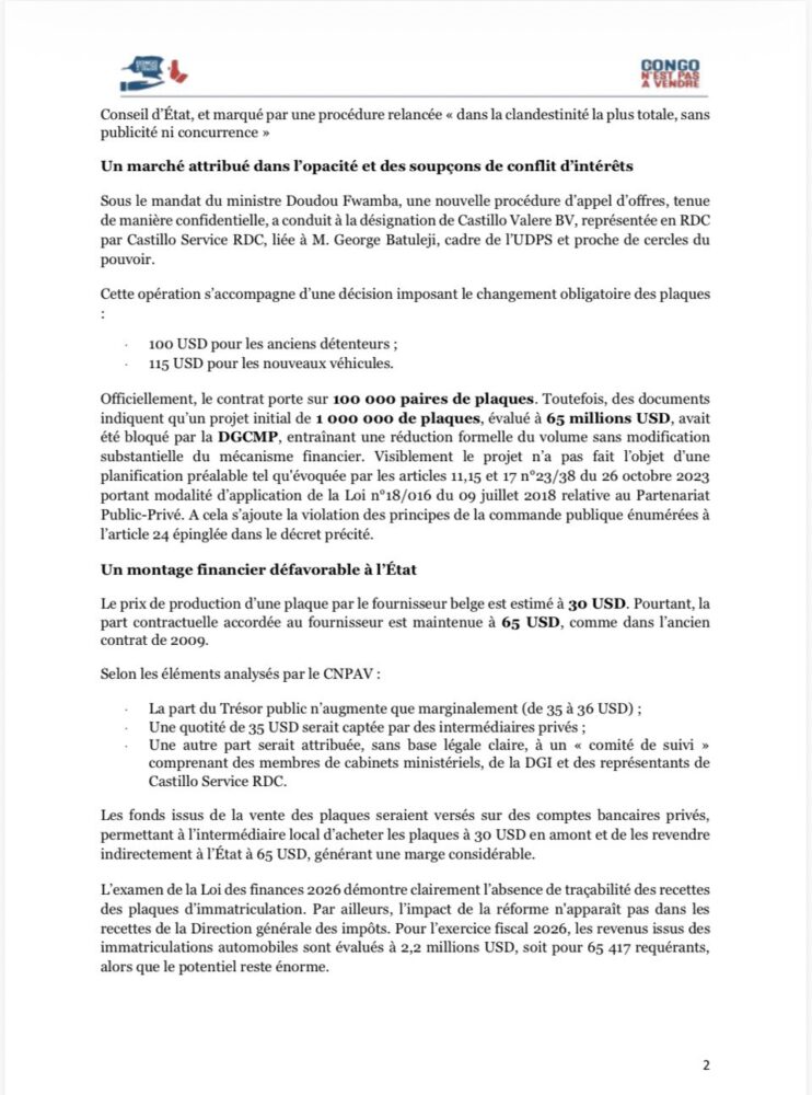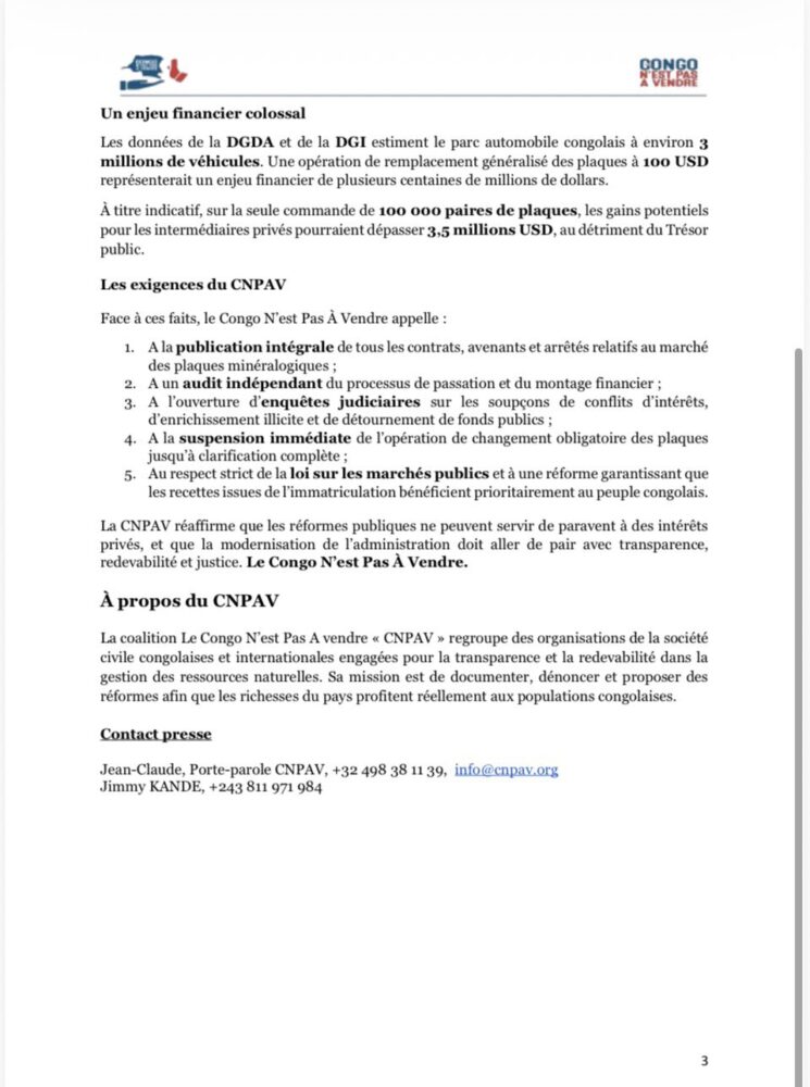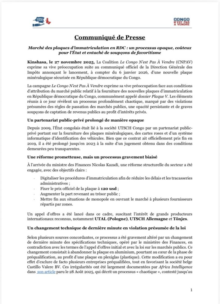 « Marchés des plaques d’immatriculation en RDC : un processus opaque, couteux pour l’Etat et entaché de soupçons de favoritisme ». C’est par ce titre que le communiqué de presse , du 27 novembre 2025, de la Coalition « Le Congo N’est Pas à Vendre » (CNPAV) alertait l’opinion nationale et internationale sur la mafia qui entoure le marché de nouvelles plaques d’immatriculation programmées pour un lancement le 6 janvier 2026.
