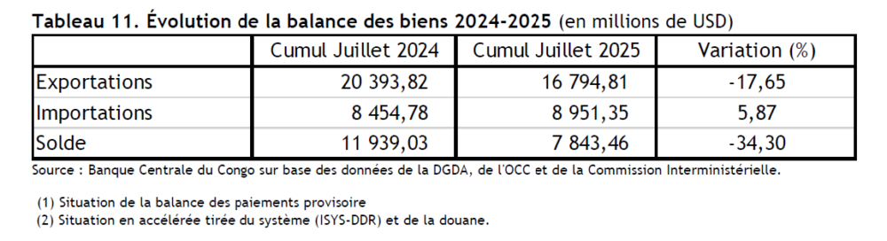 A fin juillet 2025, la balance commerciale des biens de la RDC a dégagé un excédent de 7 milliards 843,5 millions USD découlant des exportations évaluées à 16 milliards 794,81 millions USD contre des importations estimées à 8 milliards 951,35 millions USD, renseignent les données de la Banque centrale du Congo.