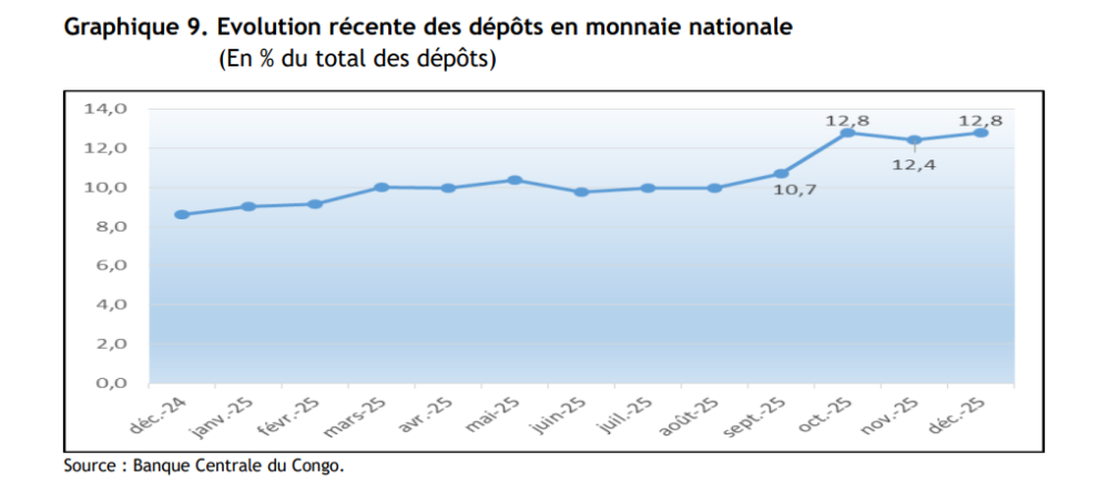 Au 30 décembre 2025, la part des dépôts effectués en monnaie nationale a connu une légère hausse, s’établissant à 12,82 % contre 12,43 % le mois précédent. Cette légère progression représente une augmentation de 0,4 point de pourcentage de leur poids dans l’ensemble des dépôts bancaires.