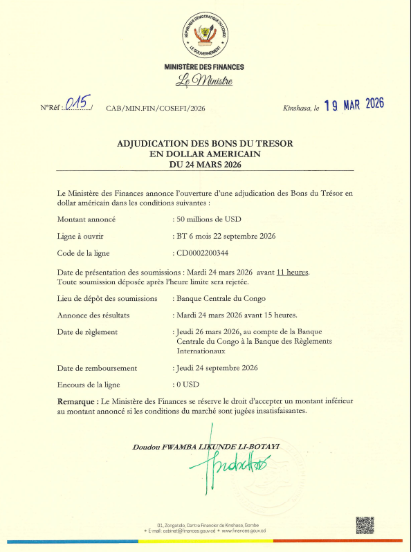 Depuis le début de l’année 2026, le Gouvernement a emprunté globalement 253,9 millions USD et 20 milliards de CDF. Le calendrier des émissions des Bons et Obligations du trésor pour le premier trimestre 2026 prévoit de lever sur le marché financier local 400 millions USD et 600 milliards de CDF.