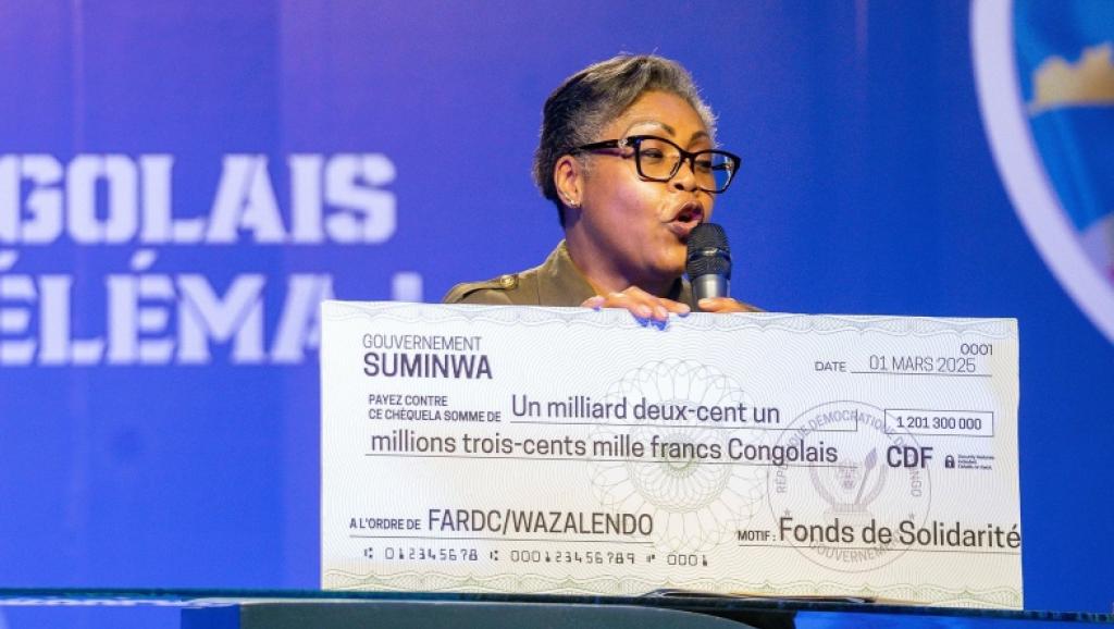 Cette image à la Une montre la Première ministre Judith Suminwa exhibant un chèque d’un milliard deux-cent un millions trois cent mille francs congolais (équivalant à l’époque 421.000 USD) en guise de l’effort de guerre, don des membres de son gouvernement, pour soutenir les vaillants FARDC et les patriotes Wazalendo face à l’agression rwandaise et des supplétifs de l’AFC/M23. Nous sommes le 1er mars 2025 au studio Maman Angebi à l’occasion du lancement de la campagne nationale de sensibilisation « Congolais Télema » initiée par le ministère de la Communication et Médias.