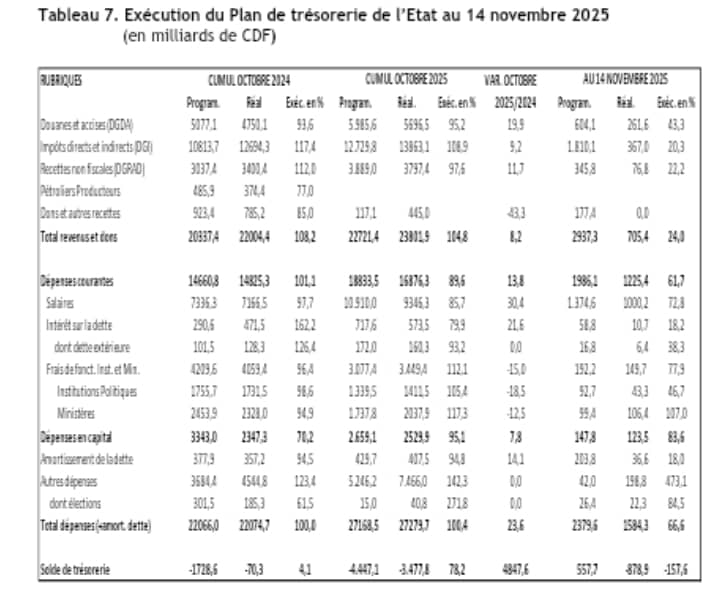 Les données de la Banque Centrale du Congo (BCC) renseignent qu’en cumul annuel, au 14 novembre 2025, l’exécution du plan de trésorerie de l’Etat s’est soldée par un déficit de 4.356,7 milliards de CDF, résultant des recettes de l’ordre de 24.507,4 milliards de CDF et des dépenses de 28.864,0 milliards de CDF.