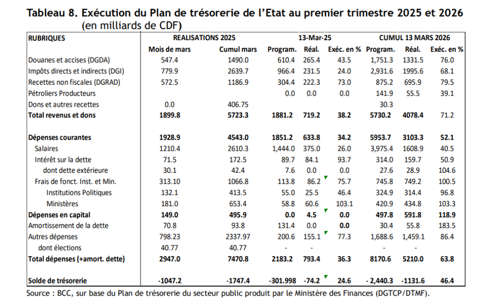 C’est un premier trimestre très difficile que le Gouvernement est en train de réaliser au début de cet exercice budgétaire 2026. Les chiffres officiels de la Banque centrale du Congo révèlent que sur des prévisions des recettes publiques de 5.730,2 milliards de CDF, à la date du 13 mars 2026, le Gouvernement Suminwa n’a pu collecter que 4.078,4 milliards CDF, soit un taux de réalisation de 71% par rapport à la cible. Cette baisse des recettes de 1.651,8 milliards de CDF (742 millions USD) a contraint l’Exécutif national à baisser également ses dépenses publiques pendant la même période. Sur les 5.953,7 milliards de CDF des dépenses programmées à la date du 13 mars, seulement 3.103,3 de CDF ont été décaissés, soit un taux d’exécution d’à peine 52%. Cette situation de faibles dépenses dictées par la baisse des recettes est révélatrice d’une crise de trésorerie aiguë impliquant le retard dans le paiement des salaires des agents et fonctionnaires de l’Etat mais surtout causant logiquement un ralentissement économique qui risque, à court terme, d’ impacter la croissance du PIB (Produit intérieur Brut) de la RDC. Désormais, le Gouvernement n’attend que l’échéance fiscale d’avril pour tenter d’équilibrer ses comptes. Cependant, rien n’est gagné à l’avance quand on sait que l’appréciation du franc congolais  (de 29%), actionnée artificiellement par la Banque centrale du Congo au dernier trimestre 2025,  devra impacter négativement la mobilisation des recettes cette année, selon plusieurs experts dont le professeur Godé Mpoyi. D’ailleurs, même le ministre des Finances Doudou Fwamba l’a reconnu dans une de ces récentes prises de parole.