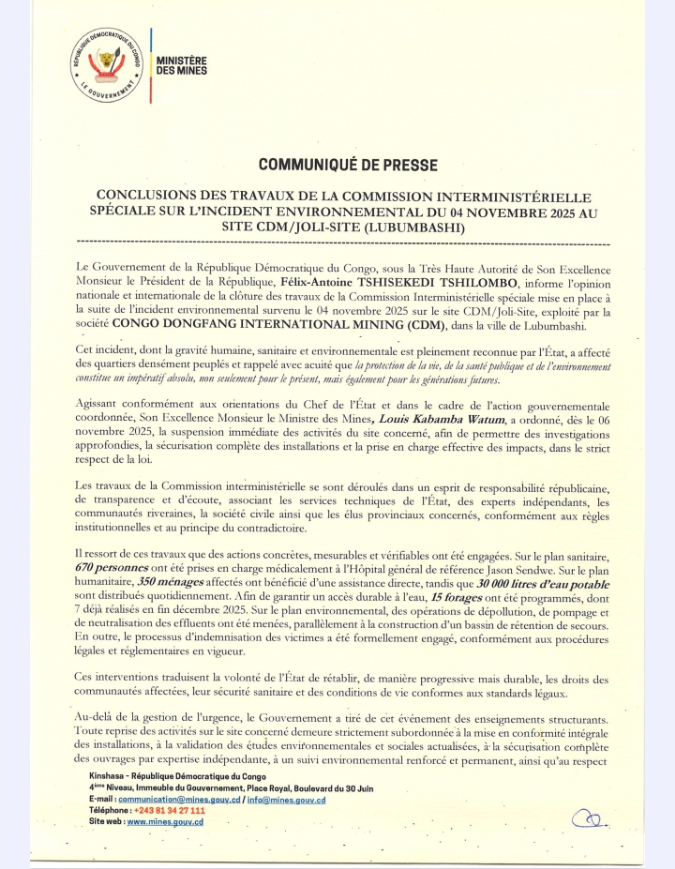 Le ministère des Mines, dans un communiqué daté du 12 février 2026, informe l’opinion nationale et internationale de la clôture des travaux de la Commission Interministérielle spéciale mise en place à la suite de l’incident environnemental survenu le 4 novembre 2025 sur le site CDM/Joli-Site, exploité par la société Congo Dongfang International Mining (CDM), dans la ville de Lubumbashi.