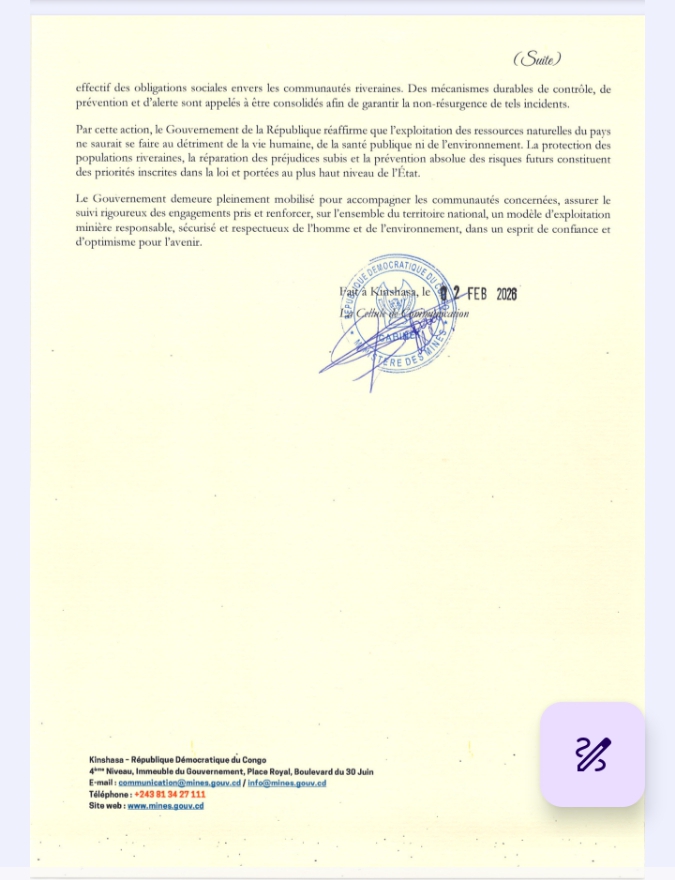 Rappelons qu’exécutant les instructions du Chef de l’État, le ministre des Mines, Louis Kabamba Watum, avait ordonné, dès le 6 novembre 2025, la suspension immédiate des activités du site concerné afin de permettre des investigations approfondies, la sécurisation complète des installations et la prise en charge effective des impacts, dans le strict respect de la loi ».