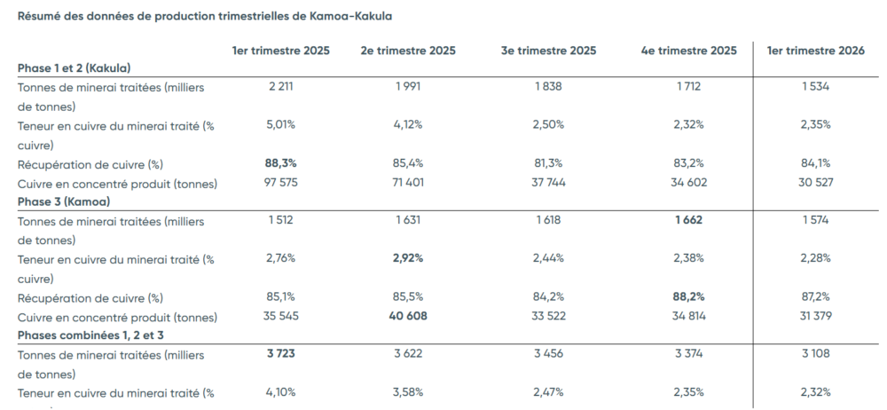 Le 31 mars 2026, Ivanhoe Mines a annoncé les résultats d’un rapport technique actualisé concernant le complexe cuprifère de Kamoa-Kakula (« Complexe cuprifère de Kamoa-Kakula »). L’estimation actualisée des réserves minérales s’élève à 466 millions de tonnes de minerai à une teneur de 2,82 % de cuivre, contenant 13,1 millions de tonnes de cuivre.