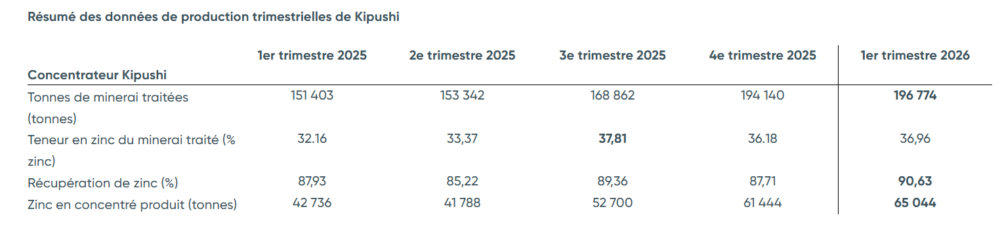 L’usine de concentration de Kipushi a enregistré un nouveau trimestre record, traitant 196 774 tonnes de minerai à une teneur moyenne de 36,96 % et produisant 65 044 tonnes de zinc en concentré, un record également. Cette production trimestrielle record représente une hausse de 6 % par rapport au quatrième trimestre 2025. De plus, pour la première fois, le taux de récupération moyen de l’usine a dépassé les 90 % au cours du trimestre.