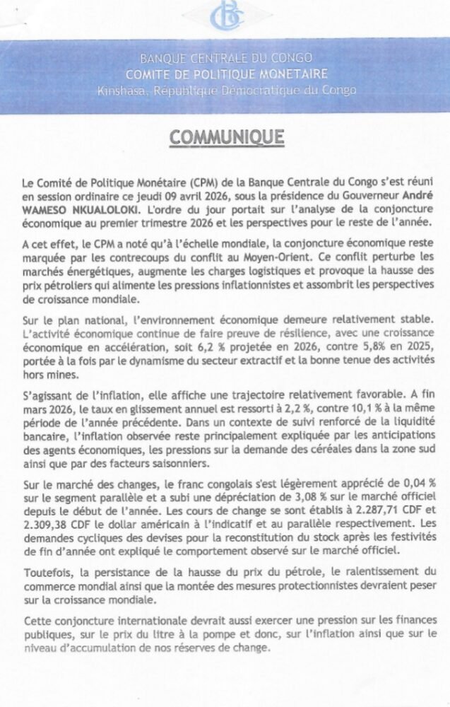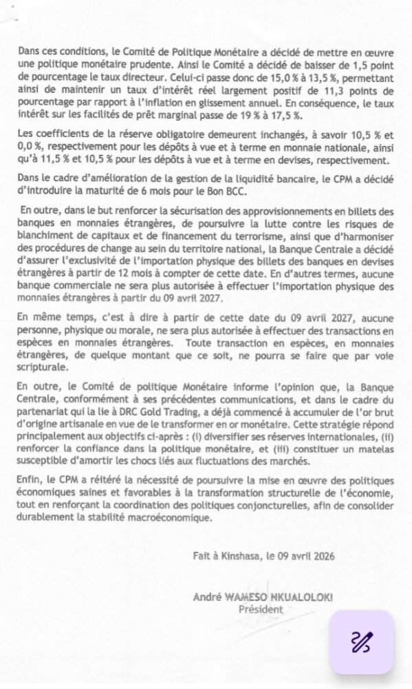 A l’issue de la région ordinaire du Comité de politique monétaire (CPM), tenue ce jeudi 9 avril 2026 sous la direction du Gouverneur André Wameso,  la Banque Centrale du Congo, a décidé de l’abaissement du taux directeur de 15 à 13,5%, rapporte un communiqué de presse de la BCC. Communiqué.