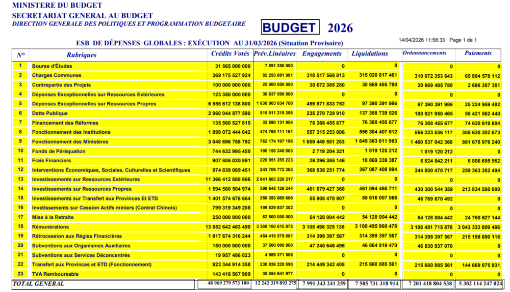 Le Gouvernement Suminwa peine à renflouer les caisses de l’Etat. Au premier trimestre 2026, le niveau des dépenses budgétisées exécutées n’a même pas atteint la moitié de ce qui était prévu dans la Loi de Finances de cette année. Preuve que le pays a fait face à une crise aigüe de trésorerie au cours des trois premiers mois de l’année 2026. Le comble est que la classe dirigeante a gardé intact son train de vie.