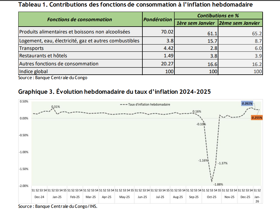 Au cours de la deuxième semaine du mois de janvier 2026, le taux d’inflation hebdomadaire est ressorti à 0,255 % en légère baisse par rapport à 0,261 % réalisé une semaine auparavant, indique la note de conjoncture économique de la Banque centrale du Congo.