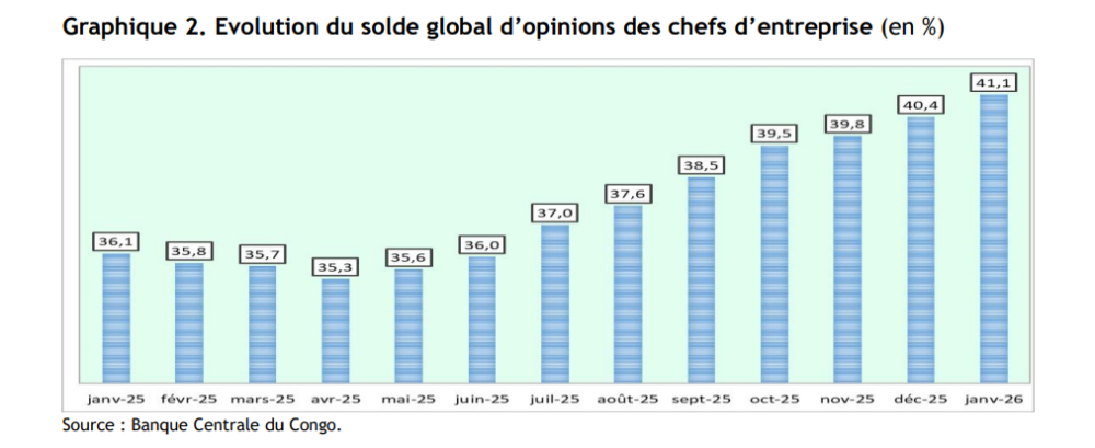 Selon la Banque centrale du Congo, au mois de janvier 2026, les résultats de l’enquête sur le baromètre de conjoncture de l’économie congolaise indiquent la poursuite du renforcement de l’optimisme des chefs d’entreprise. Leur solde global d’opinions s’est établi à +41,1 % contre +40,4 % en décembre 2025, traduisant une amélioration continue du climat des affaires en ce début d’année.