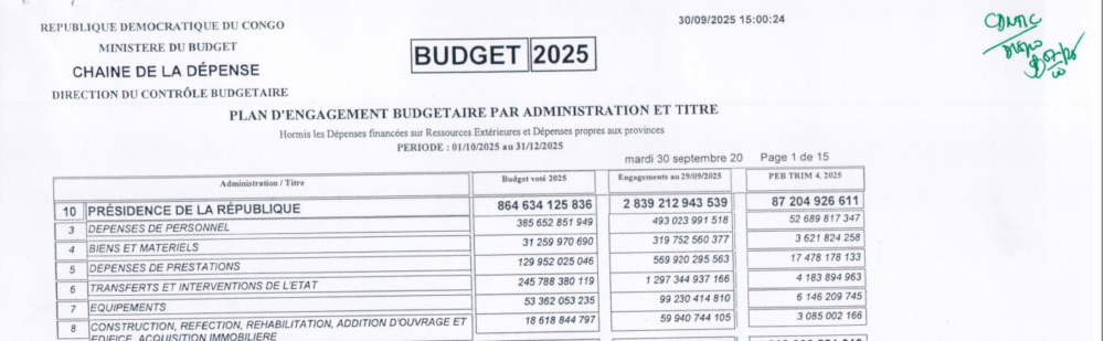 Rappelons qu’à la fin du premier semestre 2025, le compte du Trésor avait déjà payé  les dépenses de la présidence de la République à la hauteur  de 1.187,7 milliards de CDF (416 millions USD).