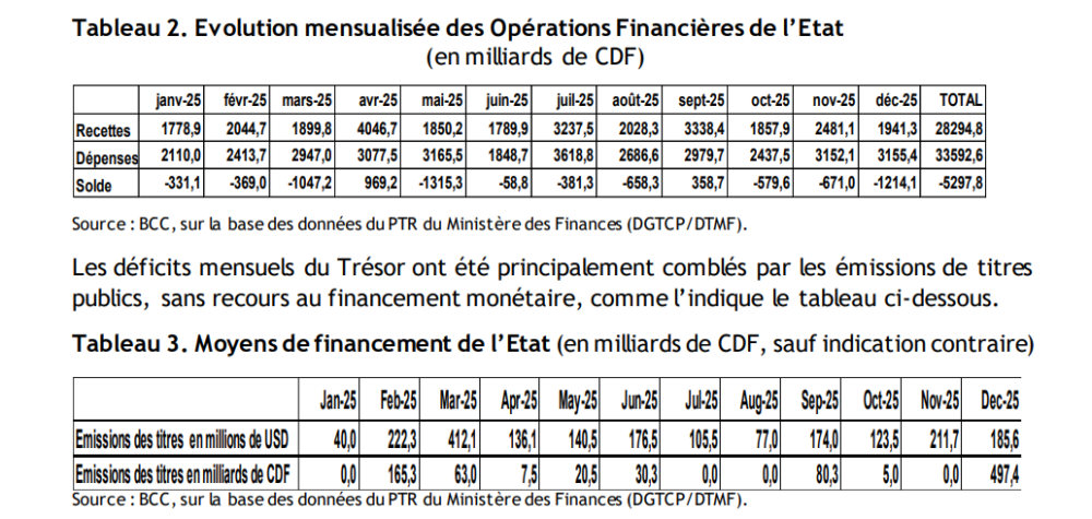 La Banque centrale du Congo (BCC) vient de publier les derniers chiffres des finances publiques pour l’exercice budgétaire 2025. Il en ressort qu’au 31 décembre 2025, l’exécution du plan de trésorerie (PTR) annuel de l’État s’est clôturée par un déficit de 5.297,8 milliards de CDF contre un déficit programmé de 4.836,1 milliards de CDF. Ce gap de financement a été principalement couvert par les émissions des titres publics sur le marché domestique, en plus des appuis budgétaires, précise la BCC.