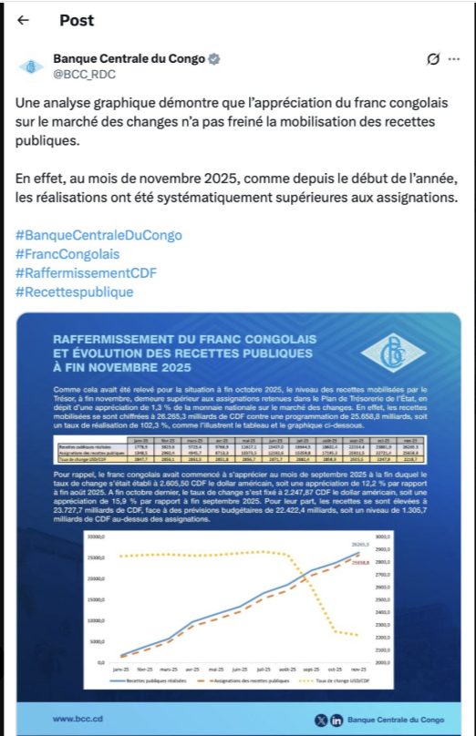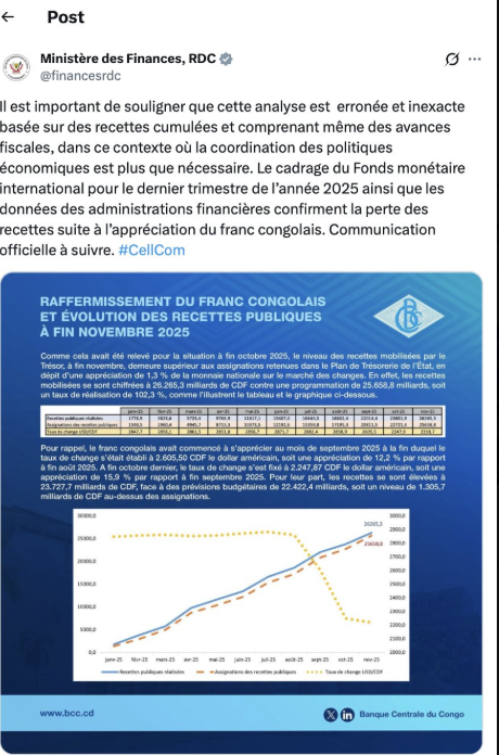D’un côté, la Banque Centrale assure que l’appréciation du franc congolais n’a pas compromis les recettes publiques. Elle avance même que les réalisations du mois de novembre 2025 ont dépassé les prévisions, témoignant, selon elle, de la résilience des régies financières. De l’autre côté, le Ministère des Finances conteste fermement cette conclusion, soulignant que l’analyse de la BCC repose sur des données cumulées, incluant des avances fiscales. Cette méthode, affirme-t-il, masque les contre-performances mensuelles réelles.